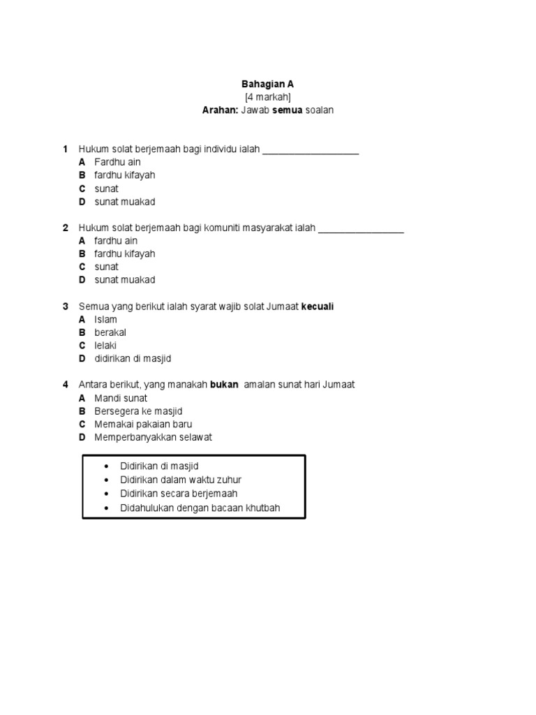 A) didirikan dalam waktu zohor b) didahului dua khutbah c) jemaah lebih 40 orang d) didirikan secara bersendirian 6) manakah antara berikut bukan amalan sunat hari jumaat. Hari jumaat adalah hari eid iaitu 'hari kebesaran' yang berulang setiap minggu atau lebih dikenali sebagai penghulu bagi segala hari. A) syarat sah b) makruh c) syarat wajib d) syarat wajib khutbah e) sunat 6) _____bukan amalan sunat hari jumaat. Berpakaian kemas.terus boleh pergi ke tempat kerja dan bawa ke masjid untuk solat jumaat; (hr.imam abu daud dan tarmidzi).